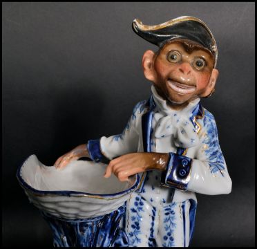 A 19th century 19th century Ernst Bohne & Söhne   porcelain centrepiece figuree table salt in the form of a monkey in sailors uniform. Stamped to underside with blue anchor mark for Ernst Bohne & Söhne "EB" & anchor mark Measures 53cms high.