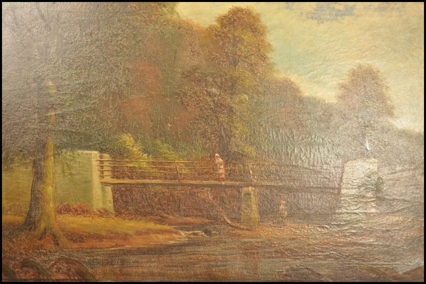 George Harris (British, 1855-1936) An oil on canvas painting of Snuffy Jacks bridge, Snuff Mills, Stapleton, Bristol. Otherwise known as Ha'penny bridge. Signed to the corner and set within a good gilt frame. Measure 85cms wide x 54cms high ( canvas )