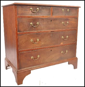 A 19th century Georgian small proportion mahogany 2 over 3 chest of drawers. Raised on ogee bracket feetwith 2 short over 3 deep drawers. Solid oak drawer linings with brass swan neck handles with flared top above. Measures 91cms high x 95cms wide x 52cms diam