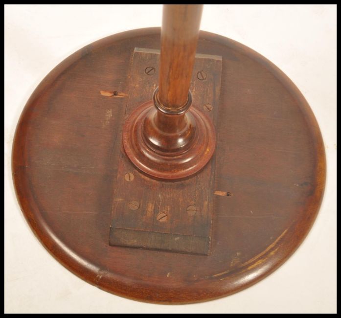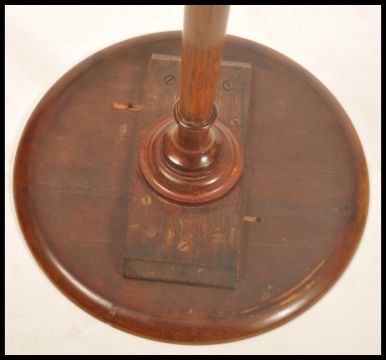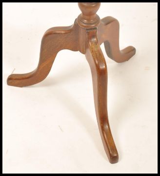 A 19th century Georgian mahogany wine table of small pedestal form. Raised on splayed tripod leg base with turned column supporting a small circular tier top with stub gallery edge. Measures 65cms high x 30cms diameter top