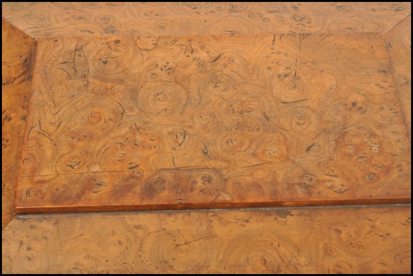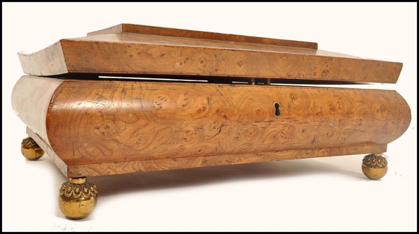 An early 19th century Georgian burr walnut work box of sarcophagus form raised on brass beaded ball feet with sloped sides and stepped lid. Hinged lid opening to reveal a spacious interior with brass dual lock and silk lined lid. Measures 14cms high by 34cms wide by 24cms deep.