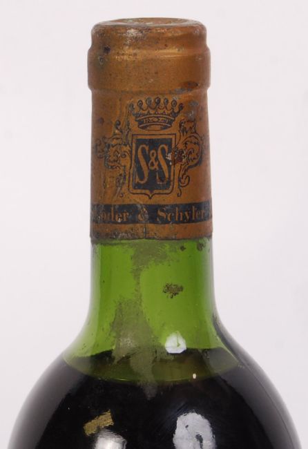 A bottle of vintage French Schroder & Schyler red wine from Bordeaux. No label present. Bottle size 750ml. Bottle sealed.