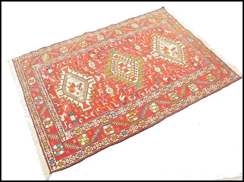 A good silk and wool South West Persian Shiraz Qashqai rug with red ground, central 3 diamond shaped medallions to centre depicting geometric patterns, fox, rabbit etc with birds elsewhere. Tassled ends. Measures 154cms x 104cms  inc tassles