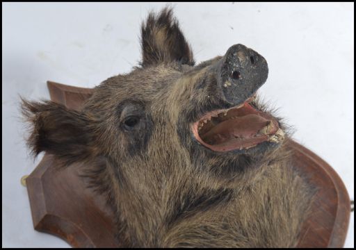 Taxidermy Interest. A French mid 20th century large taxidermy boars head being mounted onto an oak armorial shield shaped back plate with notation plaque for Sologne 1960 36cm.