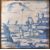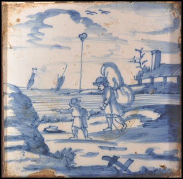 A pair of 17th century Dutch delft tiles set to oak frames. The blue and white tiles with figures to countryside and seaside, the latter with ships to background. Frames measures 20cms x 20cms