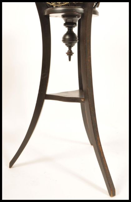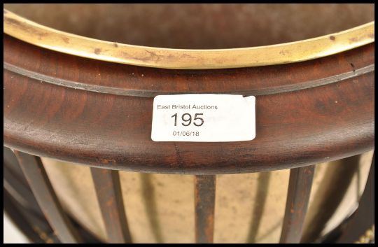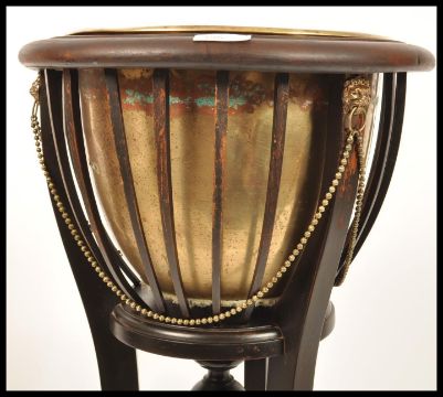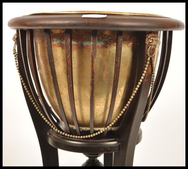 A late 19th century brass and mahogany planter stand / jardiniere. Raised on sabre supports with inverted finial centre under railed bow planter with inset brass plant pot. Finished with stunning lion mask and brass chains to sides. Measures 91cms high x 37cms diam