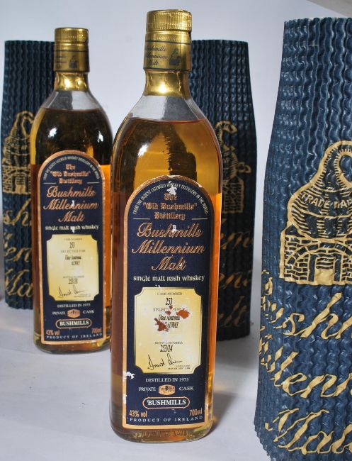 A set of 6 Bushmills Millennium Single Malt Irish Whisky. Cask Number 253 having the personalised notation for original buyer. Distilled  in 1975 Private Cask. 43% volume 700ml bottles. In original sleeves with box