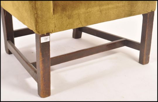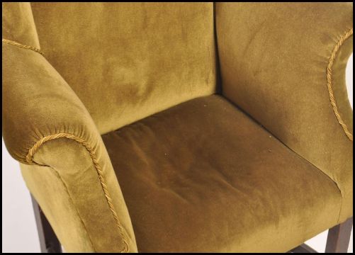 An 18th / early 19th century Georgian wingback armchair. Raised on mahogany legs with stretchers having shaped upright frame with green velour upholstery. Pronounded wing back upright with arched top rail and scrolled elbow supports. Measures 115cms high x 82cms wide