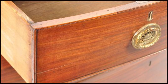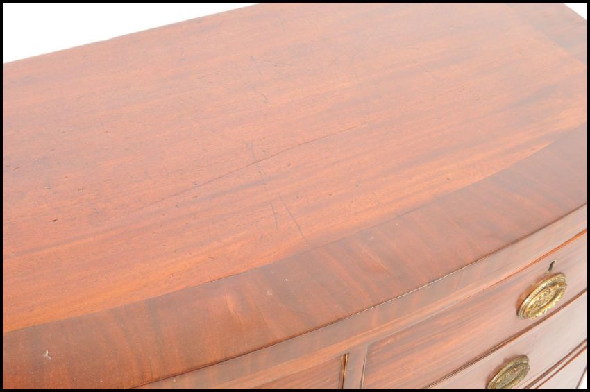A 19th century mahogany bow front  bachelors chest of drawers being raised on French ' kick legs ' supporting a good bow chest with central bank of 2 short and 2 deep drawers. All with good brass ring handles and finished with a cross banded top