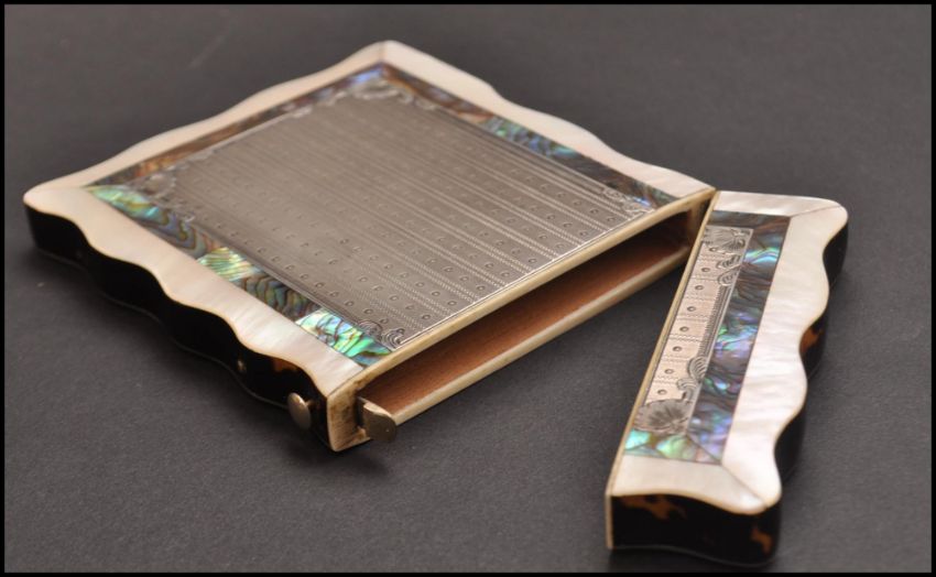 A 19th Century Victorian tortoiseshell, silver, abalone shell and mother of peal rectangular card case. Stunning silver panel with plain armorial cartouche having abalone shell and mother of pearl borders. strips within shell borders opening to reveal an ivory paneled border top and cover. Push button mechanism. Measures 11cms x 8cms