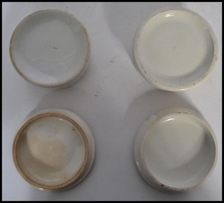 Two 19th century Victorian Prattware lids and pots, to include a family seated with sheep drinking before them with notation reading ' Peace ' together with another of fishing families. Measures 6 cm high and 11 cm diameter.