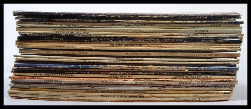 Vinyl Jazz - A good collection of long play / LP vinyl jazz record albums, featuring several artists such as Astrud Gilberto, Charlie Barnet, Billy May, Paul Weston, Harry James, Artie Shaw, Terry Gibbs, Jo Stafford, Julie London, Oliver Nelson, Dinah Washington, The Cannonball Adderley Quintet, Ray Anthony, Peggy Lee, Ted Heath, Artie Shaw, Mel Torme, Antonio Carlos Jobim, Buddy Rich, Woody Herman etc