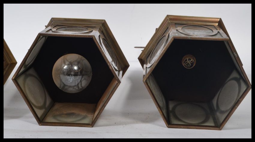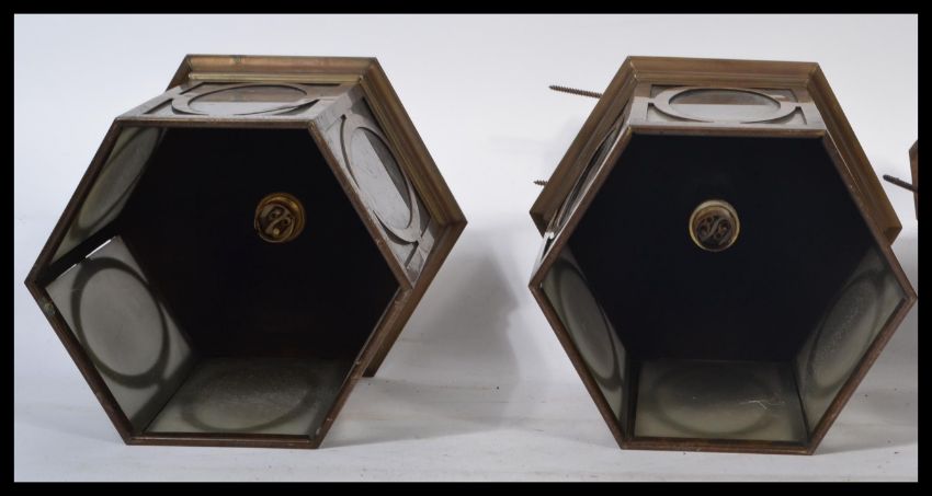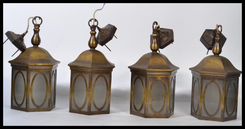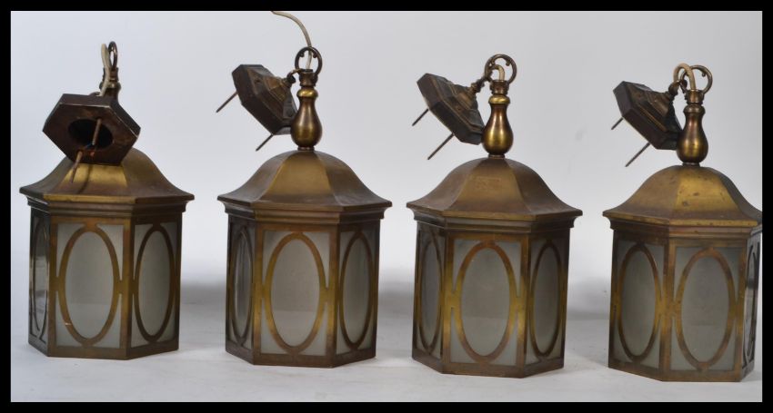 A set of four 20th century Georgian revival Porch lanterns each of hexagonal form with clear glass panels having hooks atop. Measures 43 cm high.