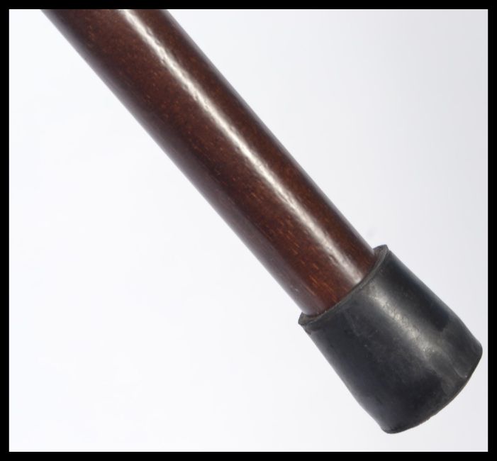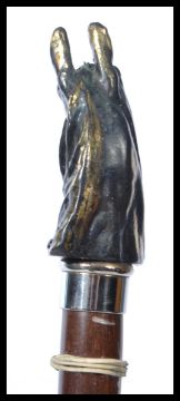 A vintage 20th century walking stick cane having a tapering wooden shaft with silver white metal collar and brass horse handle. Measures 95 cm long.