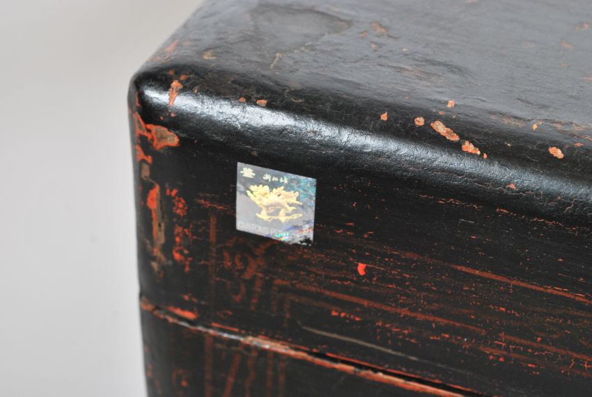 An antique Chinese Gansu province popular wood storage trunk / blanket box / coffer having a red and black crackle lacquer with handpainted water lilies decoration to front and metal wan handles to sides with the usual shaped pin locking latch.