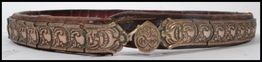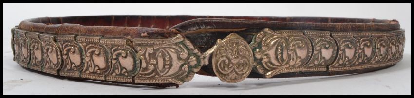 An unusual white metal and leather belt, believed early 20th century having unusual arabic design to each metal mount being threaded to the leather strap. Measures approx 90 cm length.
