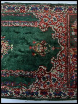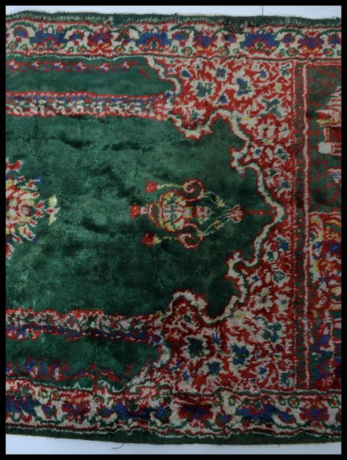 A vintage early 20th century North African prayer rug mat on red ground with green mihrab  together with a set of hide covered hand drums
