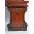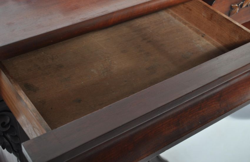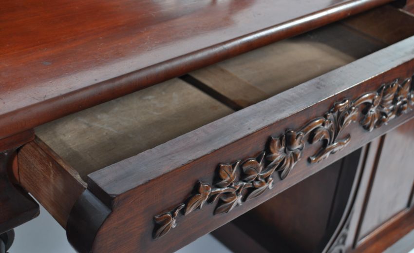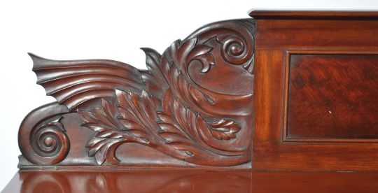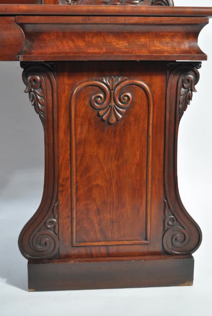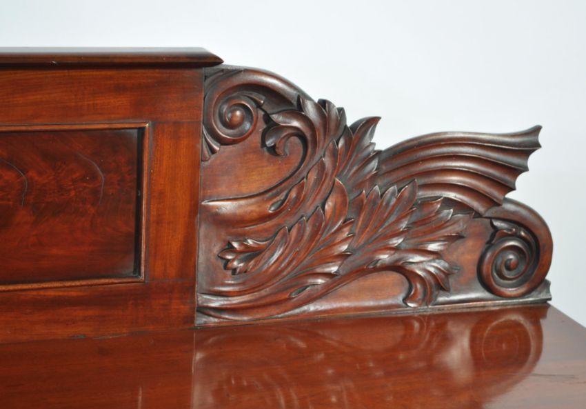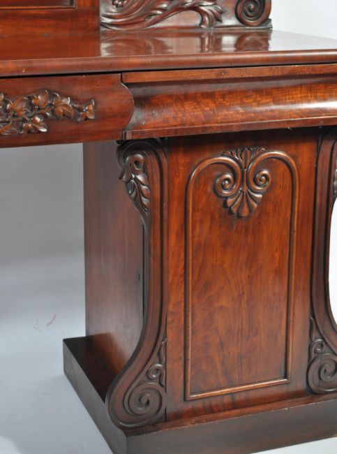 A 19th century Regency mahogany twin pedestal sideboard. Raised on twin pedestals with plinth bases and flared arches to the locker doors housing shelves within. Above a large flared sideboard top with blind fronted drawers, the central drawer with embellished details. Finished with a carved and arched gallery back. Measures 126cms high x 199cms wide x 61cms depth