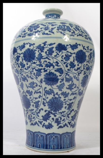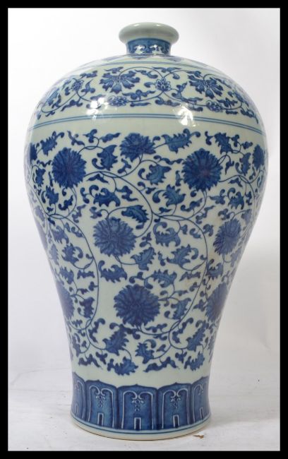 A 19th century Chinese blue and white Meiping plum shaped vase decorated with traditional scenes and floral sprays with four blue character marks to base. Measures 45 cm high.