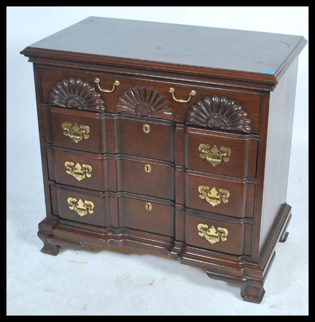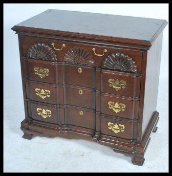 An American Federal style inverted breakfront stinkwood / stink wood chest of drawers by Harden furniture. The bank of drawers having carved shell decoration to the front. Measures 87cm x 92cm x 52cm.