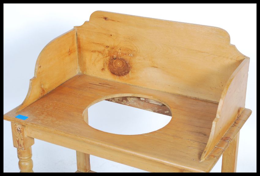A Victorian pine country washstand being raised on turned legs having gallery top with washbowl recess over 2nd tier beneath. Measures: 99cm high x 69cm wide x 4cm deep.