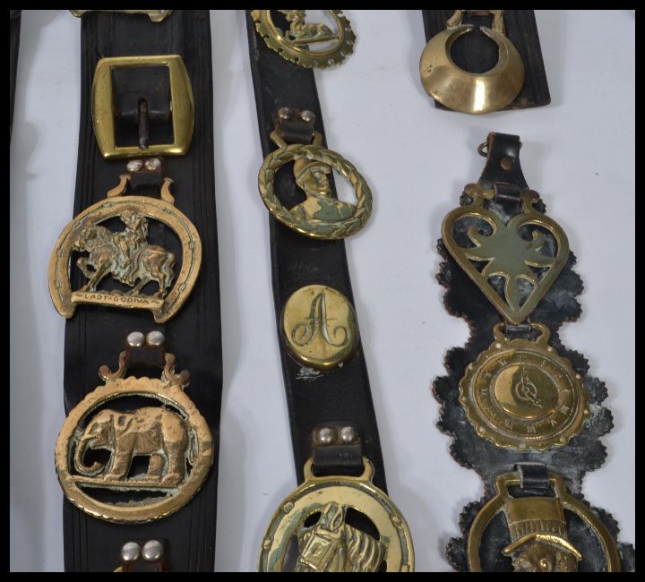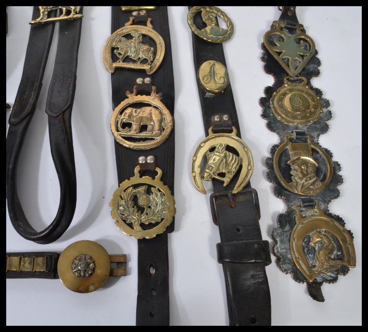 A good collection of horse brass and brasses along with martingales dating from the 19th century to include pictorial , monogram , Masonic interest , Art Nouveau etc. Please see images. Longest measures 111 cm.