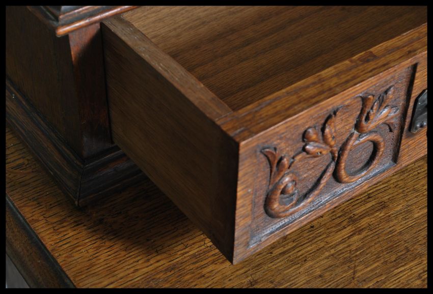 A 19th century large Arts & Crafts mirror back sideboard. Raised on tall stile legs with a series of cupboards with fielded carved panels to the fronts. Above a large bevelled edge mirror back upright with flared cornice and stunning oversized carved pilaster supports. Dismantles for 2 pieces for ease of movement
