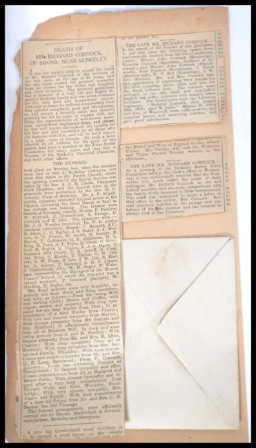 FAMILY ARCHIVE.1901-16. Cornock / Parslow of Sisons House, Wanslow, Berkeley, Glos. 100+ letters of sympathy mostly within postally used black edged mourning envelopes (many local: Dursley, Stonehouse, Sharpness, Berkeley, Gloucester, Bristol). Firstly for Mrs Cornock senior (d1901), Richard Jnr, age 14 (d1913), and Richard Snr, agricultural implement agent (d1916). Newspaper cuttings of all three funerals. Unique "In Memorium" collection.