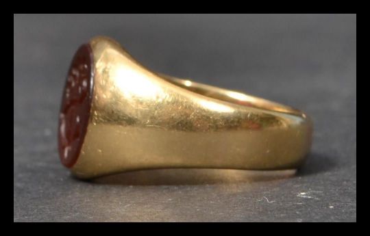 A hallmarked 18ct gold early 20th century intaglio ring set with a carnelian having carved initials within an oval cartouche. Hallmarked Birmingham 1922. Weight 12.2g. Size S.