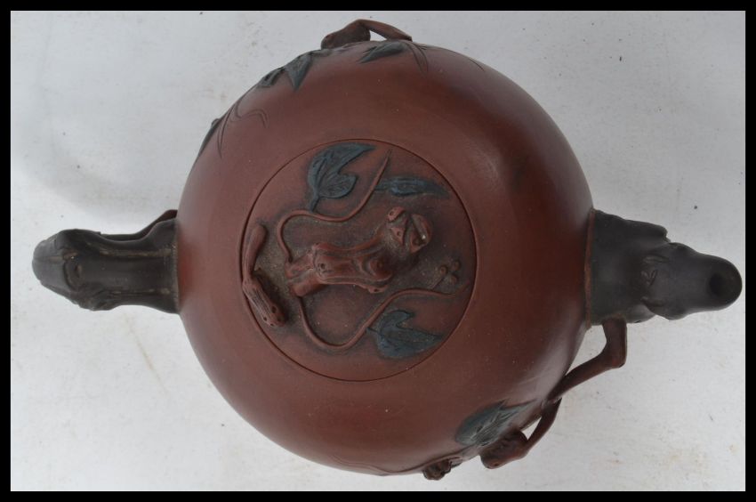 A 19th century Chinese terracotta tea pot having relief molded branch decoration with wood effect handle. Four character marks to base. Measures 12 cm high.