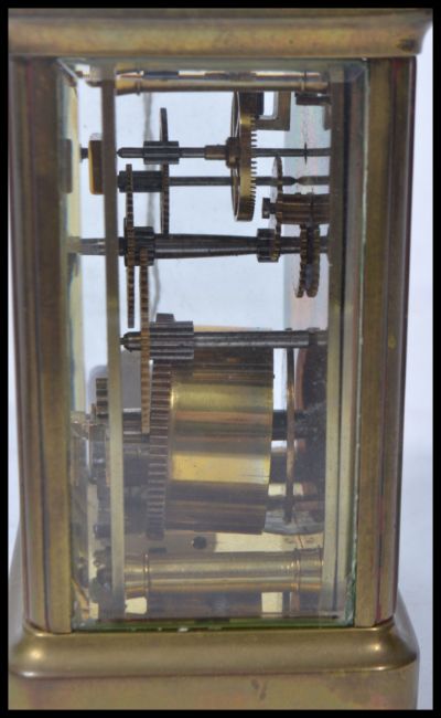 An early 20th century brass carriage clock with enamel dial, roman numeral chapter ring with faceted hands being marked for RF Beard, Cheltenham. Paris made  with single barrel movement.