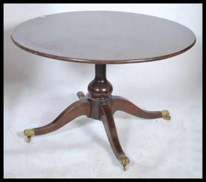 A 19th century Regency mahogany large tilt top breakfast table - loo dining table being raised on splayed legs with brass cap castors. Turned column with large circular table top above