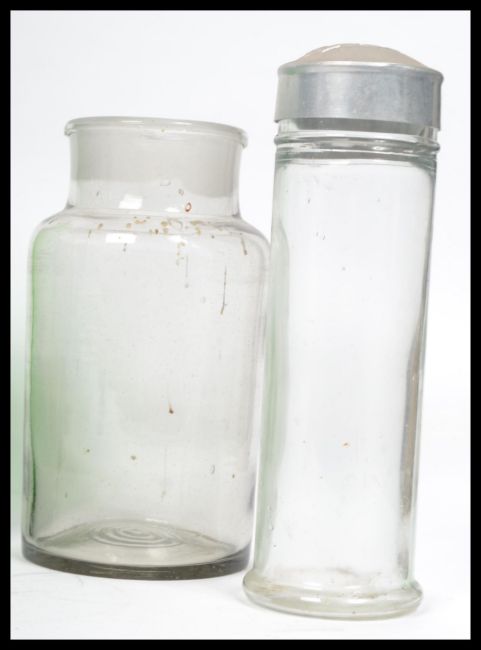 A collection of early 20th shop sweet confectionary glass jars. One with original aluminium lid marked ' Zubes ' together with 2 green glass examples, again one with remains of original labels. Together with 3 further clear glass examples