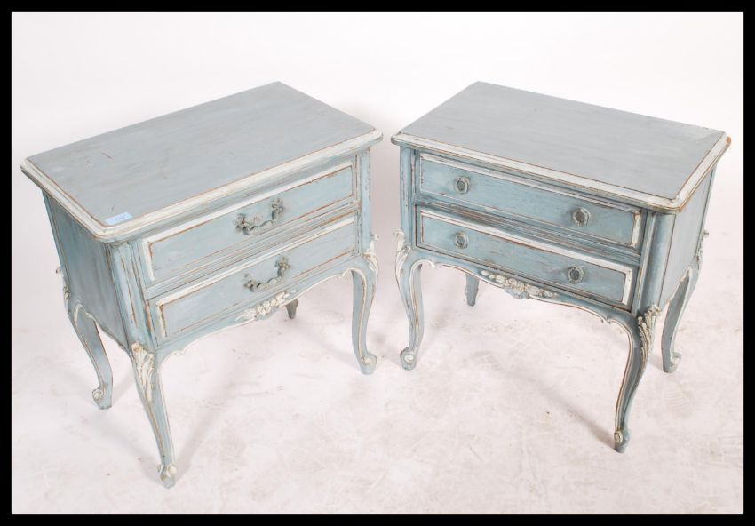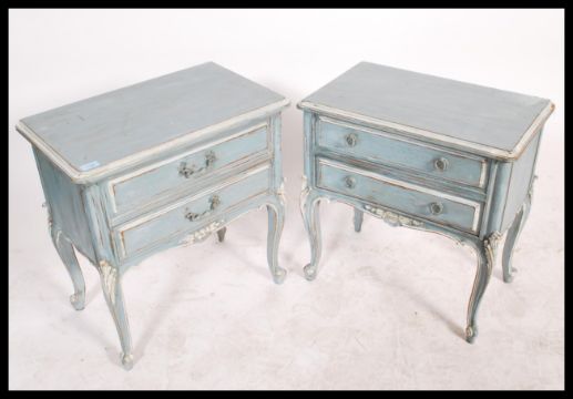 A pair of 20th century French oak painted Louis XV style bedside cabinets, hoof feet with cabriole legs with twin drawers and flared tops above