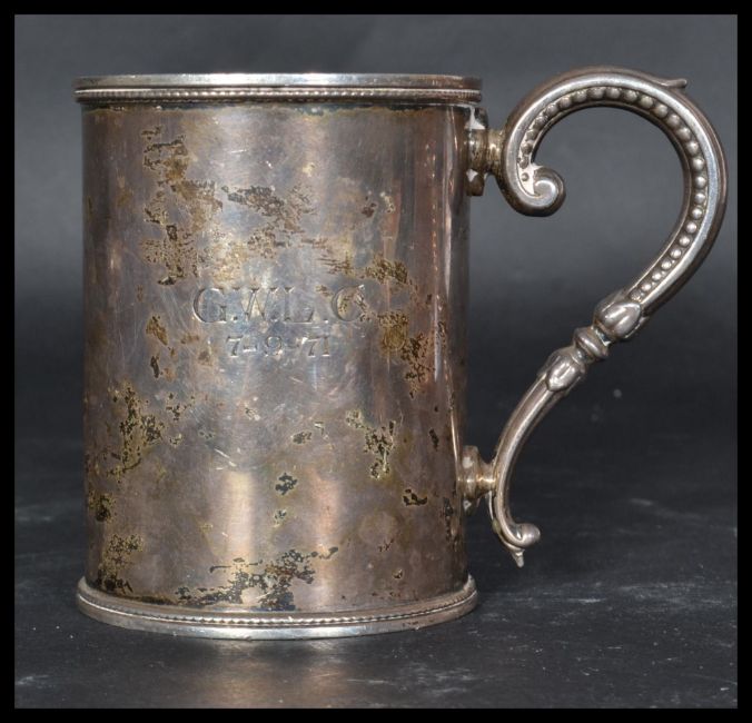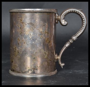 A 19th century Victorian silver hallmarked tankard of cylindrical form having a scrolled handle. Hallmarked for Chester 1897 makers believed Henry Matthews. Weighs 121.2 grams. Measures 8.5 cm high.