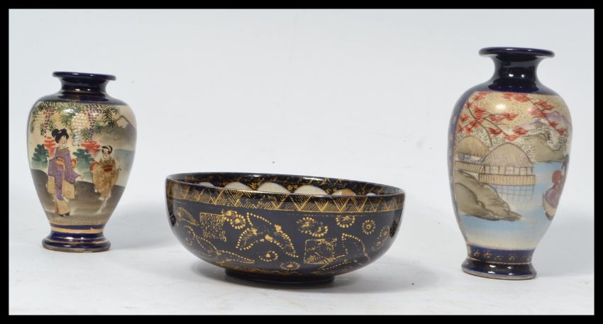 A 19th century Japanese kutani ware bowl depicting Geisha's and temples along with a pair of Japanese vases of similar pattern having cobalt ground. Signed to base. Measures 16 cm high.