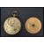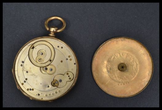 A vintage 18ct gold ladies fob watch with engine turned face and faceted hand ( af ) set with a mother of pearl pocket watch travel case with appointed interior, glass window atop. Weight 34.3g