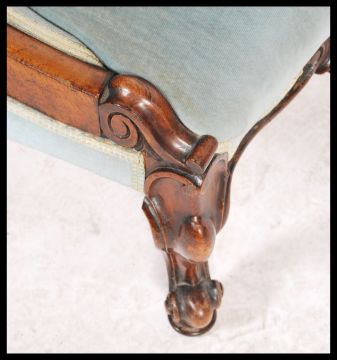 A Victorian mahogany ladies open sided armchair being raised on shaped legs with show wood scrolled frame upholstered in blue velour fabric. 92x55x68
