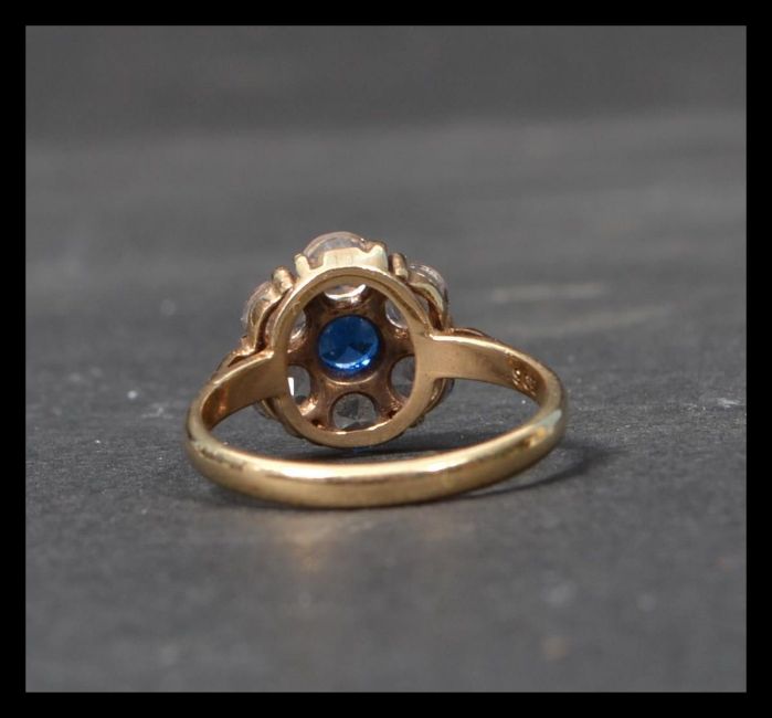 A 9ct gold cluster ring set with a central round brilliant cut stone surrounded by a halo of white stones. Marked 9ct tests 9ct gold. Weight 3g. Size N.