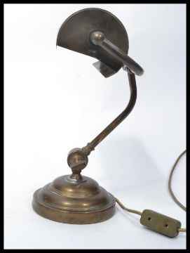 A vintage mid century brass bankers lamp raised on terraced base having angular and adjustable shade.