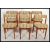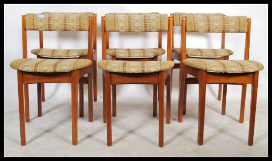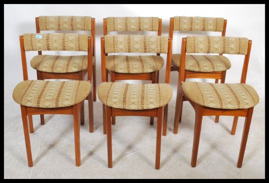 A set of six retro 20th Century Danish inspired dining chairs. Woollen seat and back pad upholstery raised on tapering legs united by stretchers. Measures: 82cm high x 62cm wide x 45cm deep.