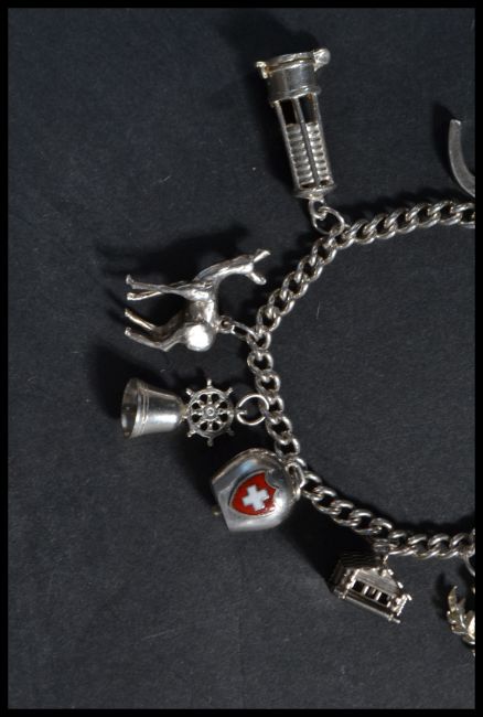 A hallmarked 925 silver charm bracelet having charms to include  lamp, Swiss bell, stallion, deer, ships bell. Measures 7.5 inches. Weight 36.9