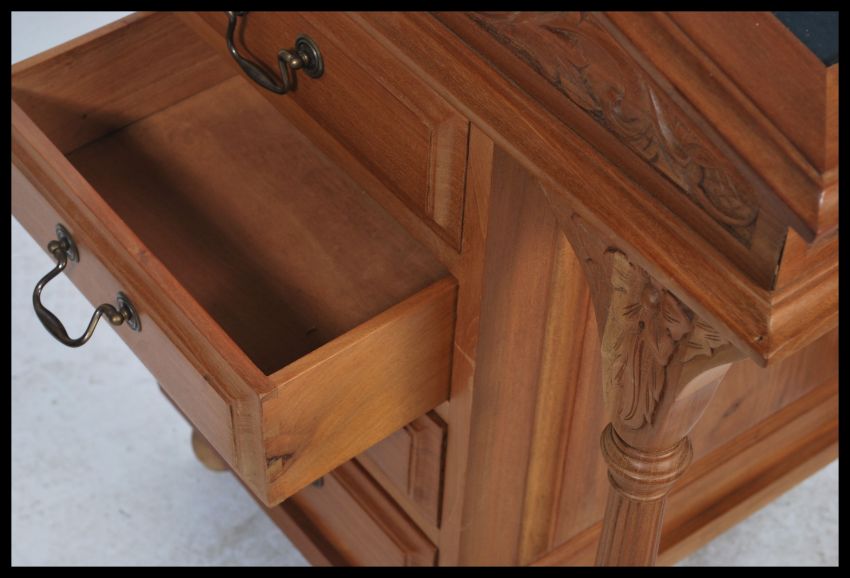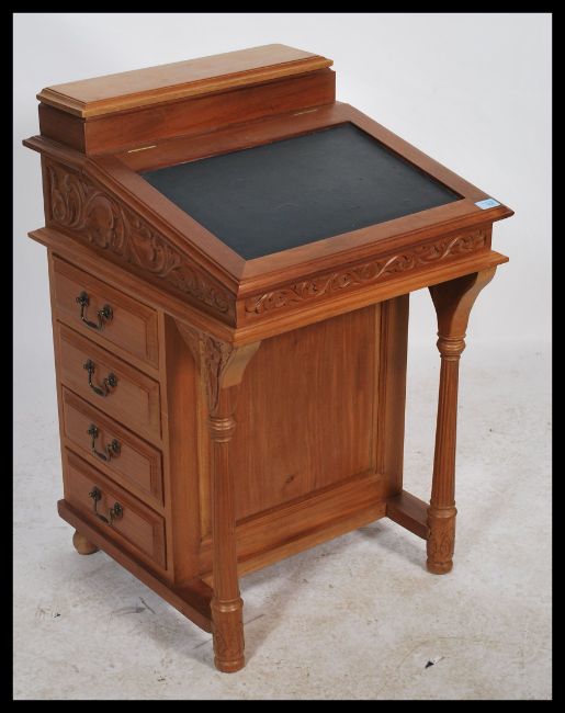 A contemporary 20th Century Davenport writing desk, hinged leather tooled slope with fully appointed interior series of drawers to side. 85x54x58