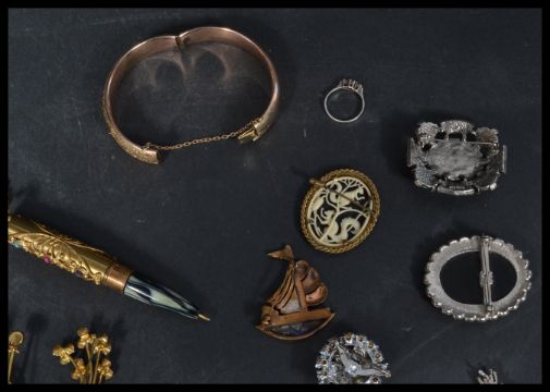 A group of vintage costume jewellery to include a yellow metal bangle bracelet , various brooches , yellow metal pen , etc. Please see images.