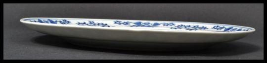 An early 19th century Chinese blue and white cabinet plate depicting fighting warriors and mountains. Scrolled floral borders with hand painted details. Measures 25 cm diameter.