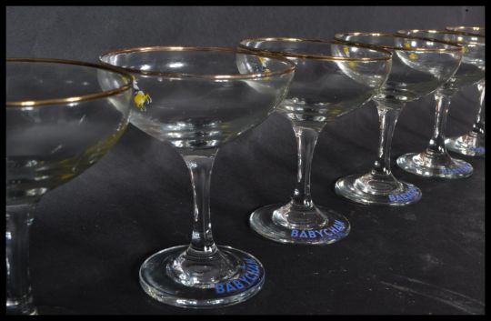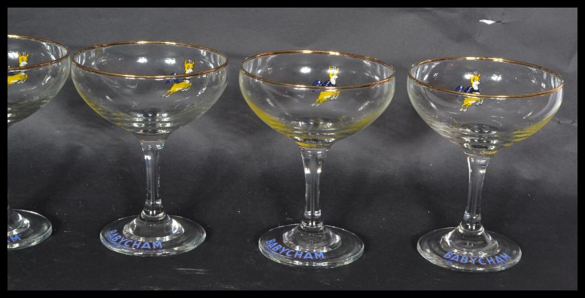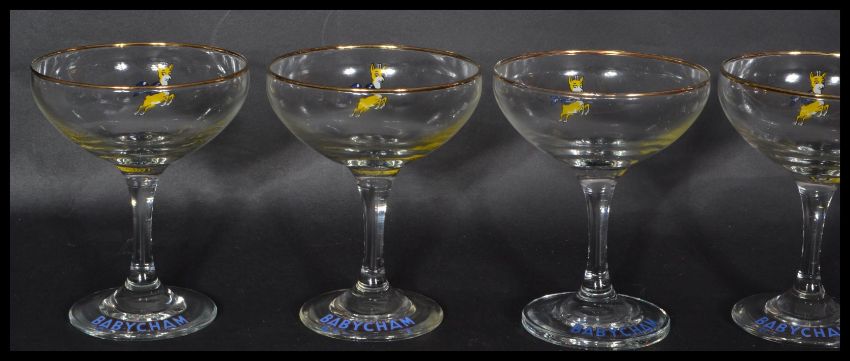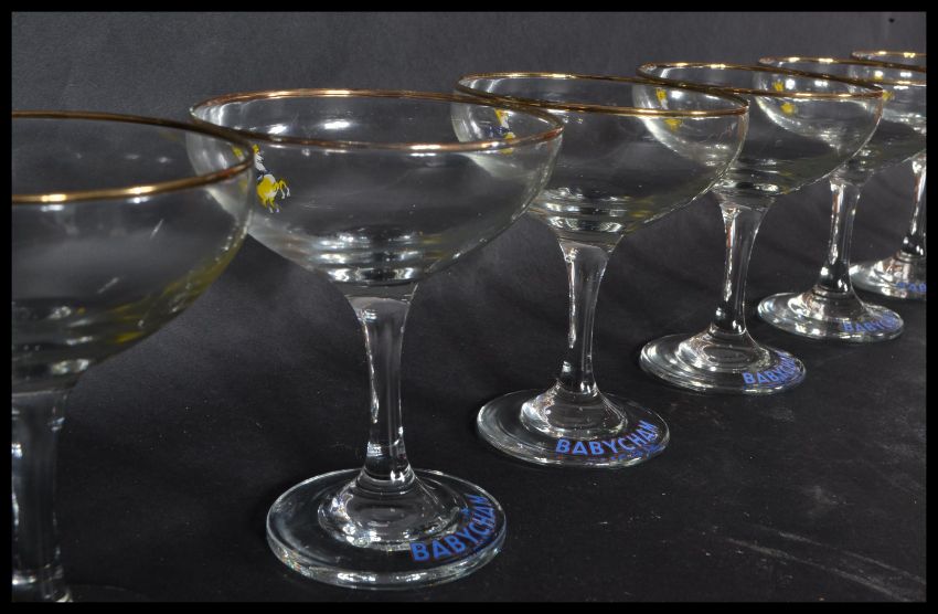 A group of 9 vintage 20th century retro 1970's Babycham glasses having shaped bowls with cylindrical stems with the yellow Babycham faun to each glass. Measure 11 cm high.