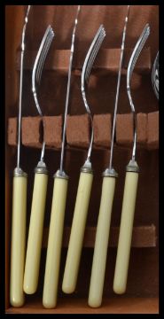 A 1930's canteen of cutlery having a hinged centre with appointed interior complete with canteen of flatware cutlery. Case measures 12 cm high, 45 cm wide and 31 cm deep.