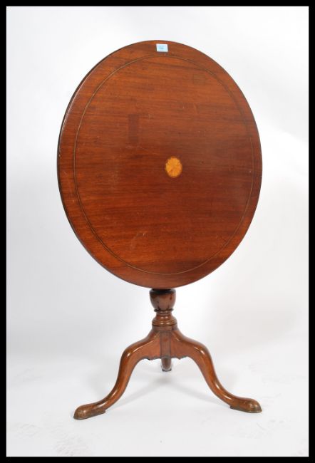 A George III mahogany inlaid tilt top wine table, the circular top above a bird cage mount, raised on a turned baluster column and tripod feet. 71x49 diameter