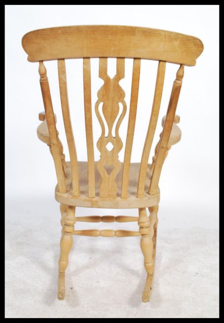 An antique style beech wood Windsor style lathe back rocking chair. Raised on turned legs on sleigh runners united by stretchers having saddle seat, lathe back rest and shaped elbow supports.