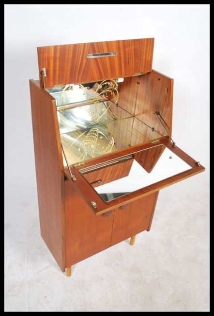 A 1970's retro teak wood cocktail drinks cabinet with metamorphic action mirror and decorative glass appointed interior over a cupboard beneath. All with roundel handles and tapering legs.  Measures 101cm x 60cm x 29cm.